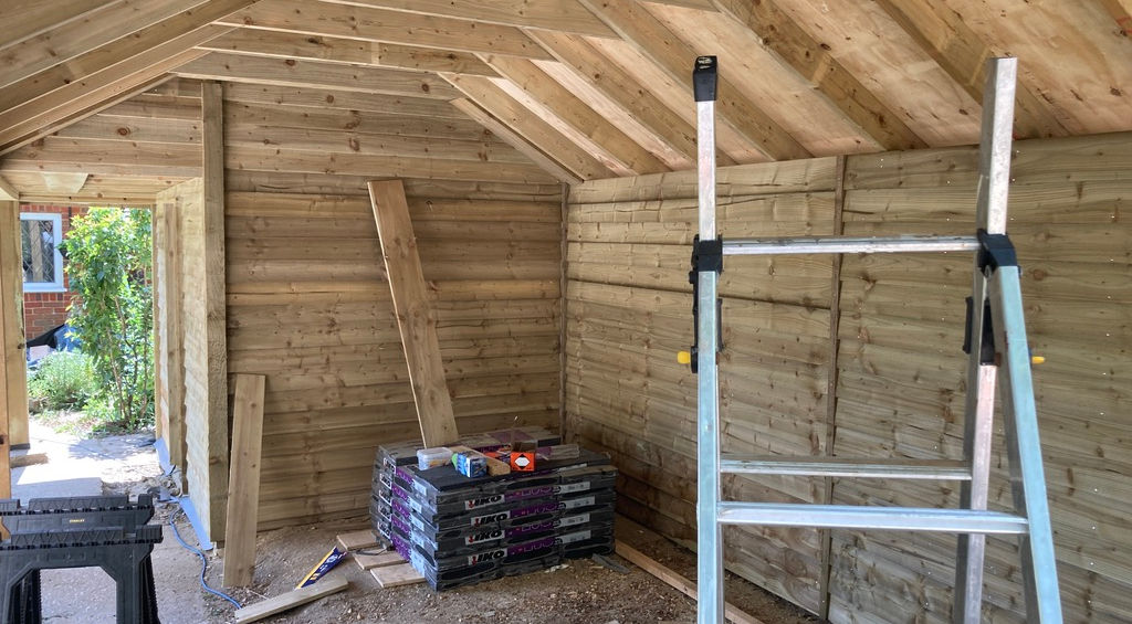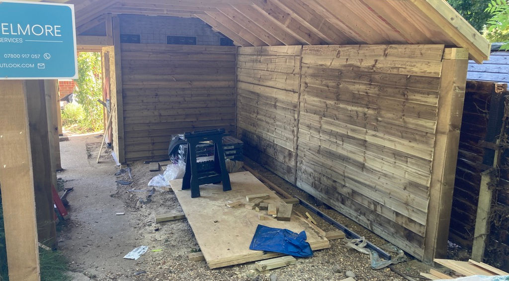 We erected this 10 x 3.6m structure in the footprint of the old structure, with an inset storage building with a loft space extending over the walkway. The roof was is a simple 18mm ply covered in felt shingles and the building is clad in treated softwood feather edge boards. We also build a lean-to log store to the rear.